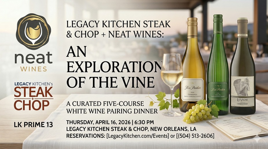 As the days grow longer and the New Orleans breeze turns sweet, we’re setting the table for a celebration of the season. Join us at Legacy Kitchen Steak & Chop for an exclusive Five-Course Spring Wine Dinner. We’ve partnered with the experts at Neat Wines to curate a journey through the world’s finest white varietals, each perfectly paired with a seasonal dish designed to bring out their flavors. This is a well-structured menu that balances the decadence of a steakhouse with the lighter notes of spring. The pairing of Neat Wines selections offers a great contrast between Old World (Loire Valley, Italy) and New World (Paso Robles, Santa Barbara) styles. Including, including Fess Parker (Santa Barbara, California), Angel Falls (Lorie Valley, France), Border Rows (Italy), and Le Vigne (Paso Robles, California)